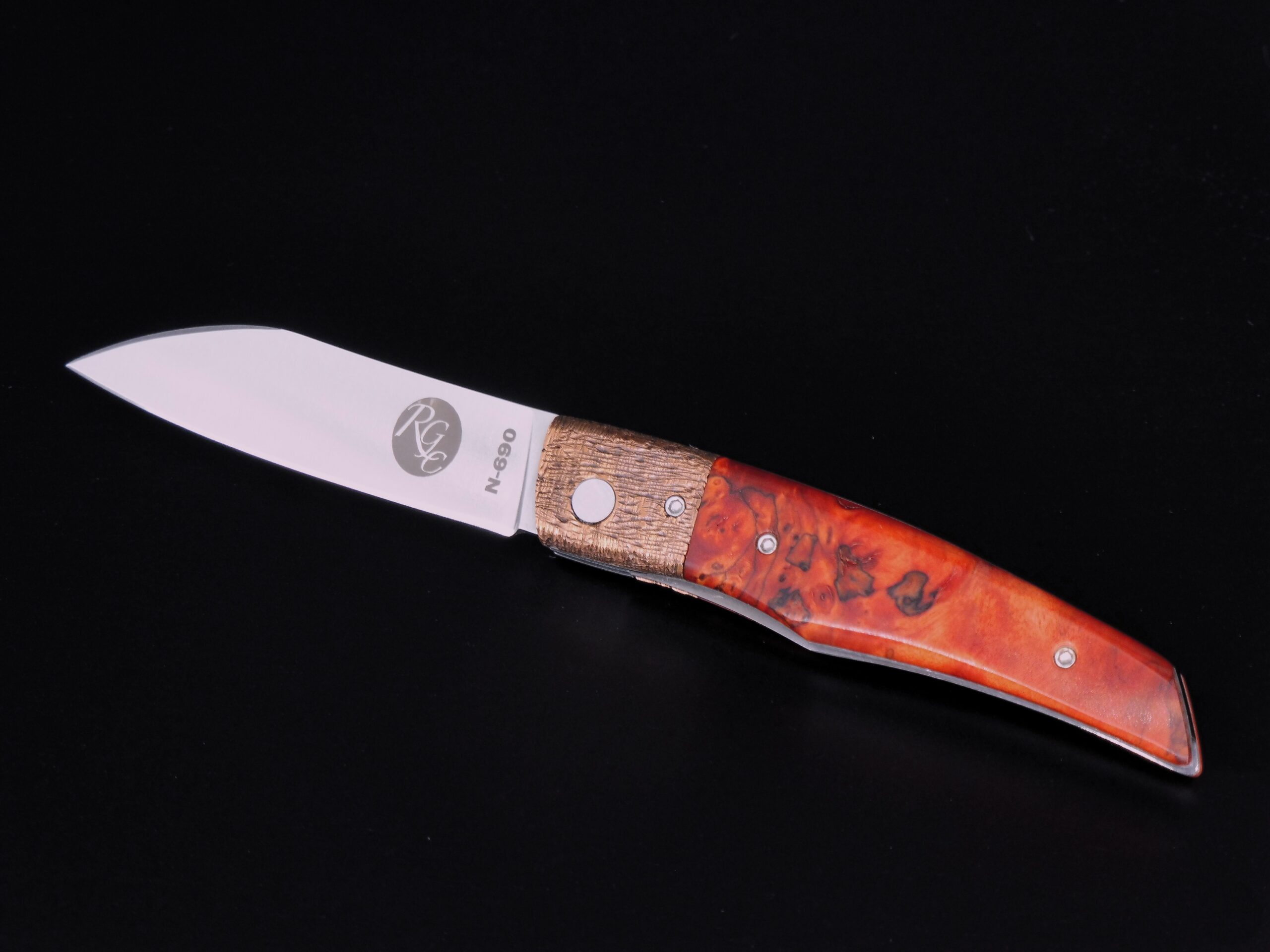 Hoja.- BÖHLER N690 Cachas.-RAIZ ESTABILIZADA Virolas.-COBRE Largo de Hoja.-70 MM Largo total.-163 MM